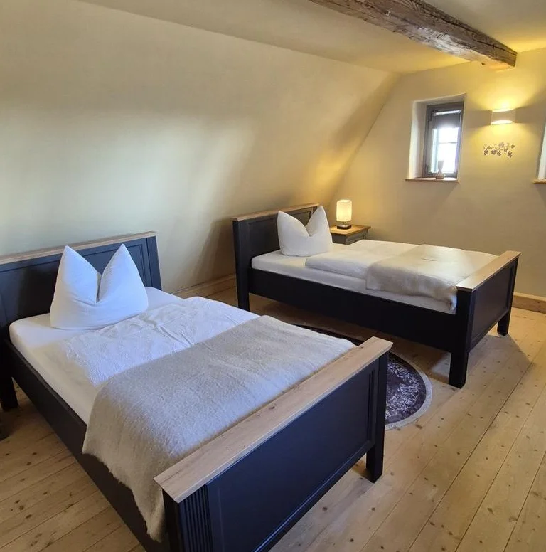Weiterhin finden sie im Obergeschoss 3 Schlafzimmer mit insgesamt 6 Schlafplätzen, eine große exclusive Küche und einen Gewölbekeller für individuelle Feiern.